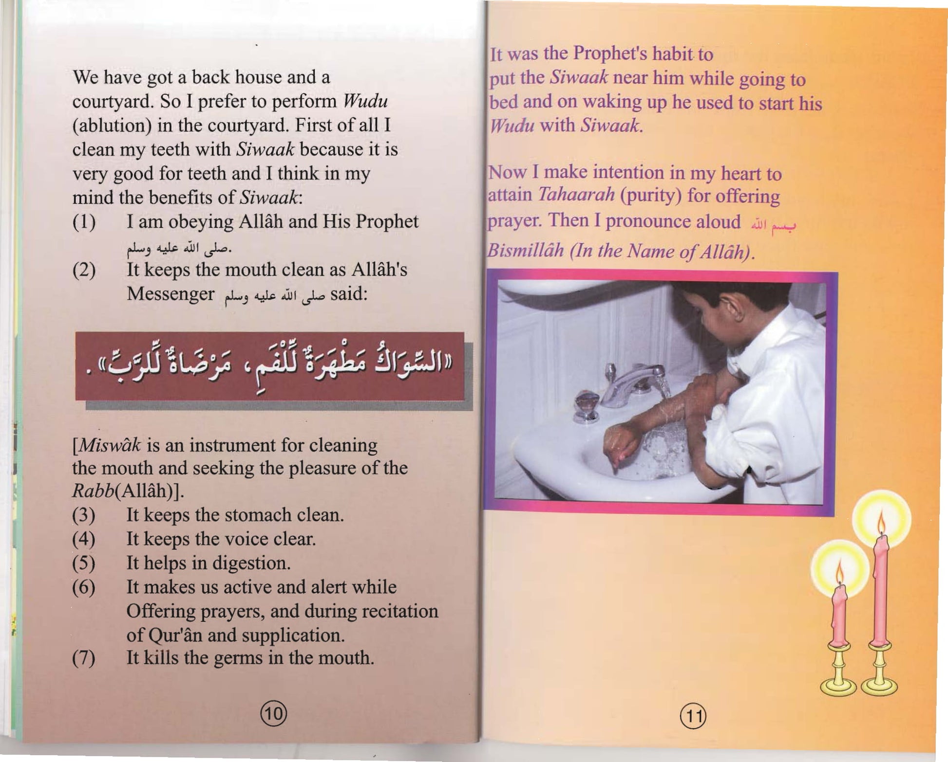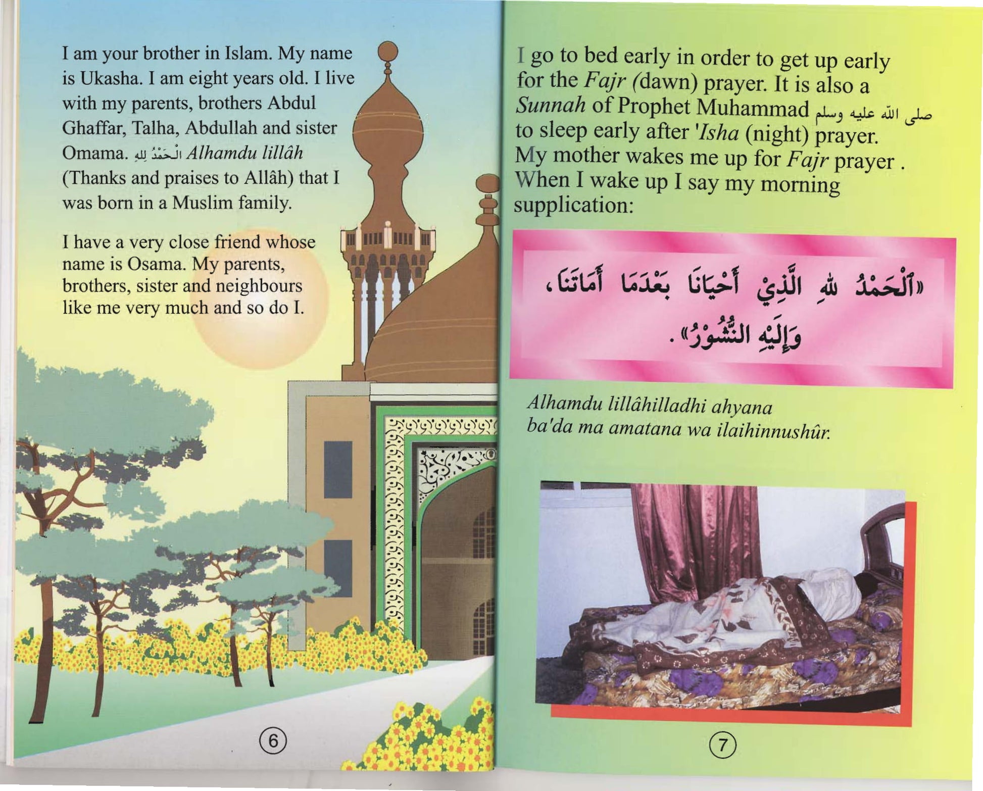 This beautiful book describes a day in the life of a Muslim Child. From waking up to going to bed at night it goes over all the basic dua's that should be recited in our daily lives. It includes dua's for waking up, leaving/entering the restroom, before/after eating and those needed through out the day. The whole book is told from Ukasha's point-of-view in a story like manner.