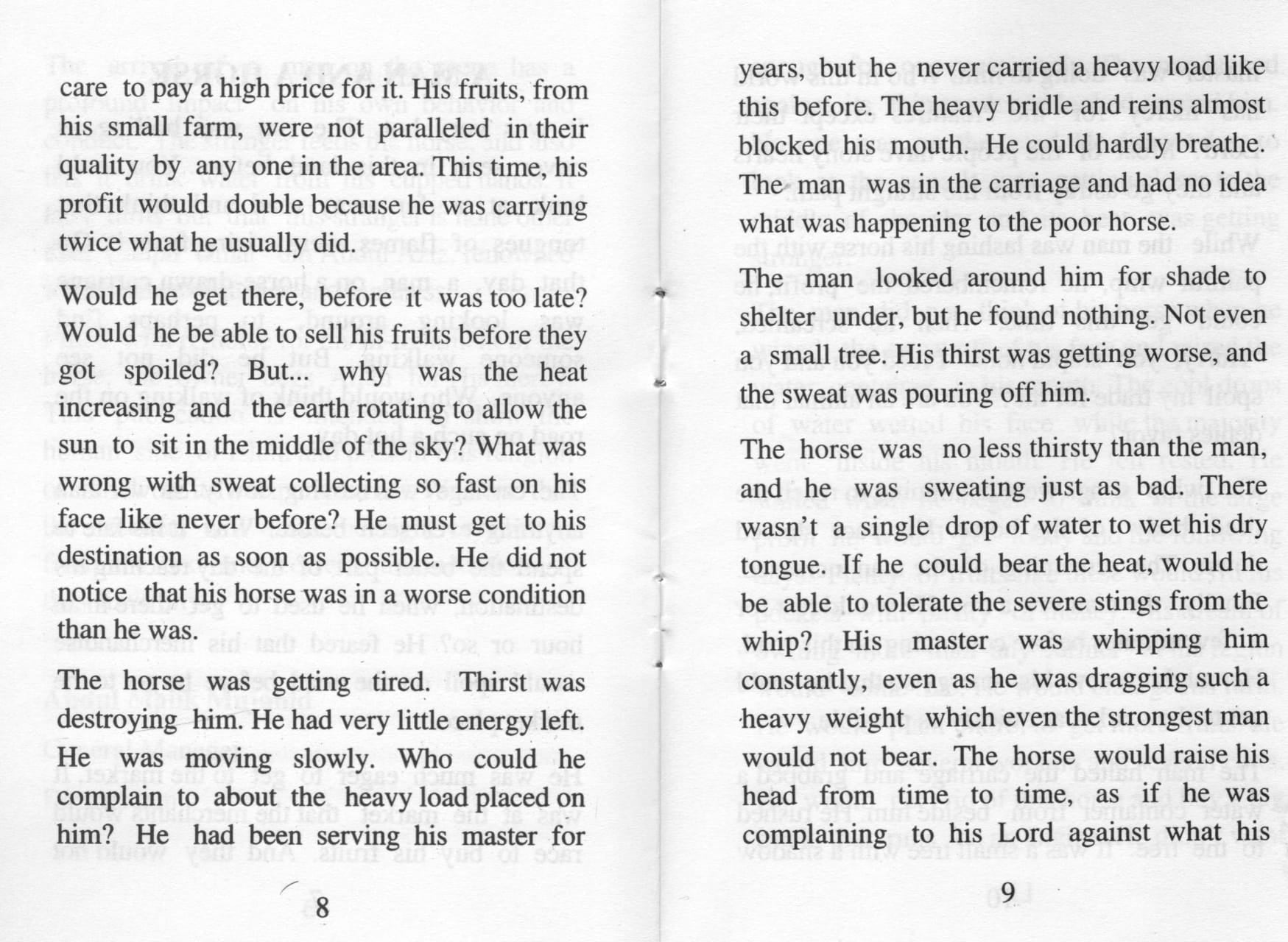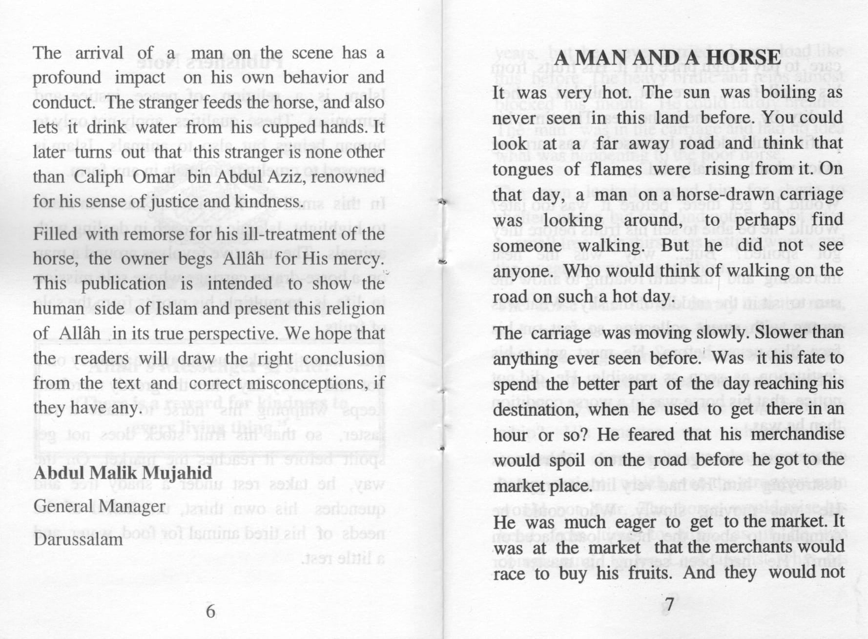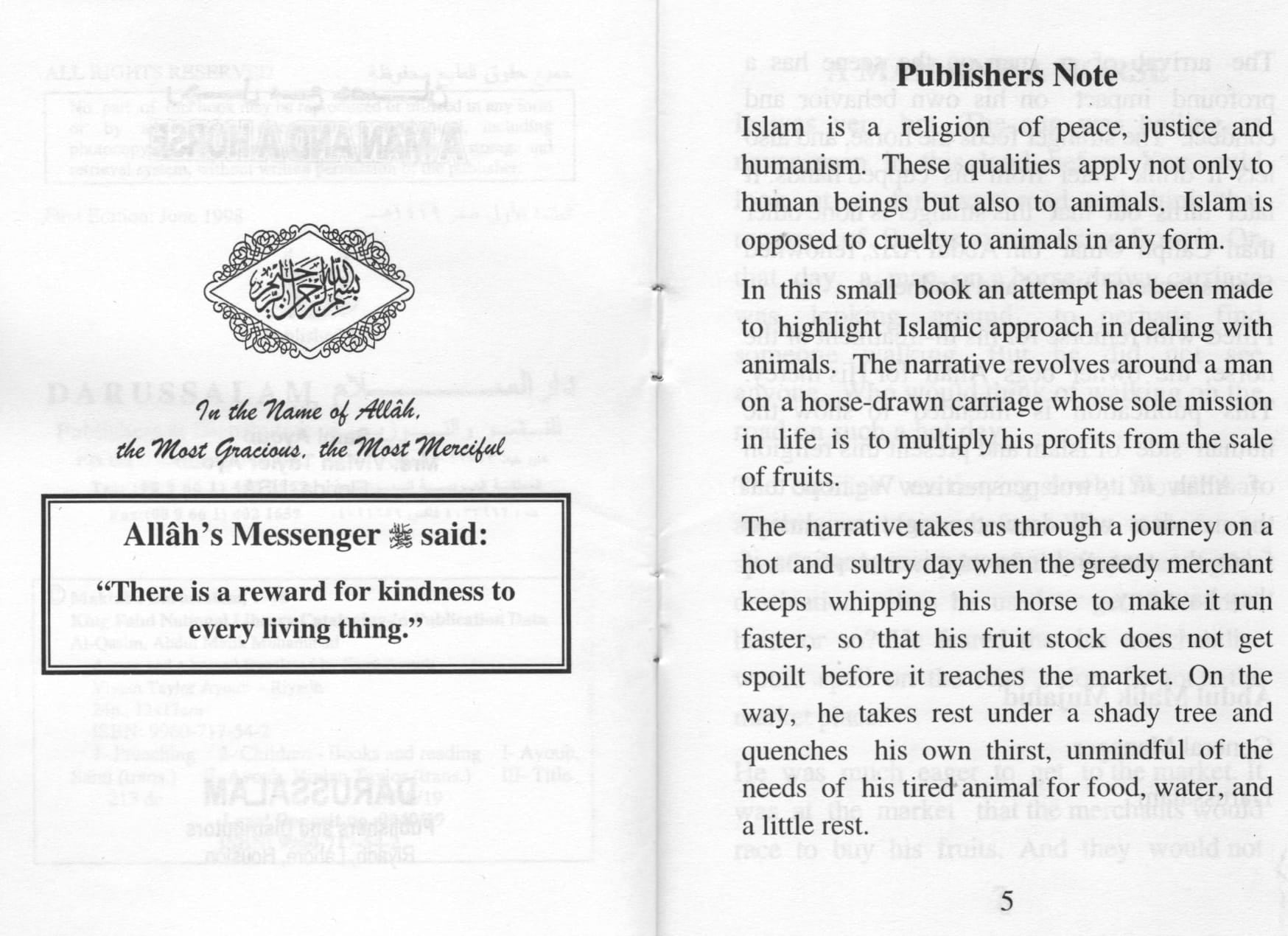 A Man and A Horse by Darussalam is a short story written by Sami Ayoub and Mrs. Vivian Taylor Ayoub. Although small in size this book gives a huge lesson regarding the treatment of animals in Islam. It highlights the correct Islamic approach in dealing with animals through a short story of a man traveling in a horse-drawn carriage and having the sole mission of selling his merchandise in the market and multiplying profits. He is visited by a strange as he rests under a tree and is taught a lesson he would never forget.