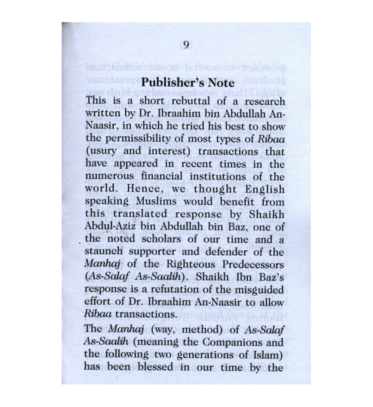 This Short Response By Shaikh Ibn Baz That Asserts The Strict Prohibition Of All Types Of Ribaa Transactions Comes At A Time When Several So-Called Scholars Are Issuing Fatwas (Religious Decrees) Allowing Some And Even Most Types Of Ribaa. These False, Deviant And Erroneous Fatwas Are Especially Welcomed By Some Muslim Communities And Individuals Who Live In Non-Muslim Countries And Who Often End Up Imitating The Ways Of The Kuffaar (Disbelievers) In The Societies In Which They Live. Such People Quickly Embrace The Misguided Fatwas That Allow Ribaa, Because They Think That These Fatwas Legalize And Justify Their Indulging In The Various Types And Forms Of Ribaa That Exist In The Present Time. I Ask Allah To Benefit These Muslims And The Rest Of The Muslim Ummah (Nation) With This Rebuttal So That They All Refrain From Indulging In Ribaa, In Particular, And In All That Allah Has Forbidden For Them, In General. I Also Ask Allah To Bless The Efforts Of Our Scholars Who Surely Face Tremendous Challenges In Recent Times, Often Defending The Religion Of Allah And His Stated Limits On Several Fronts At The Same Time.
