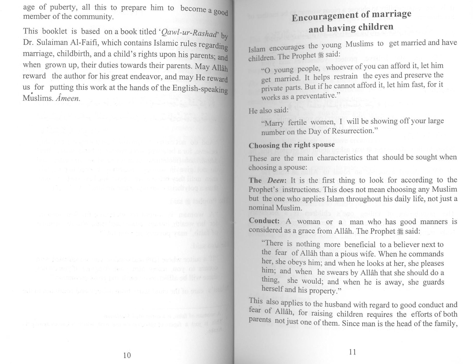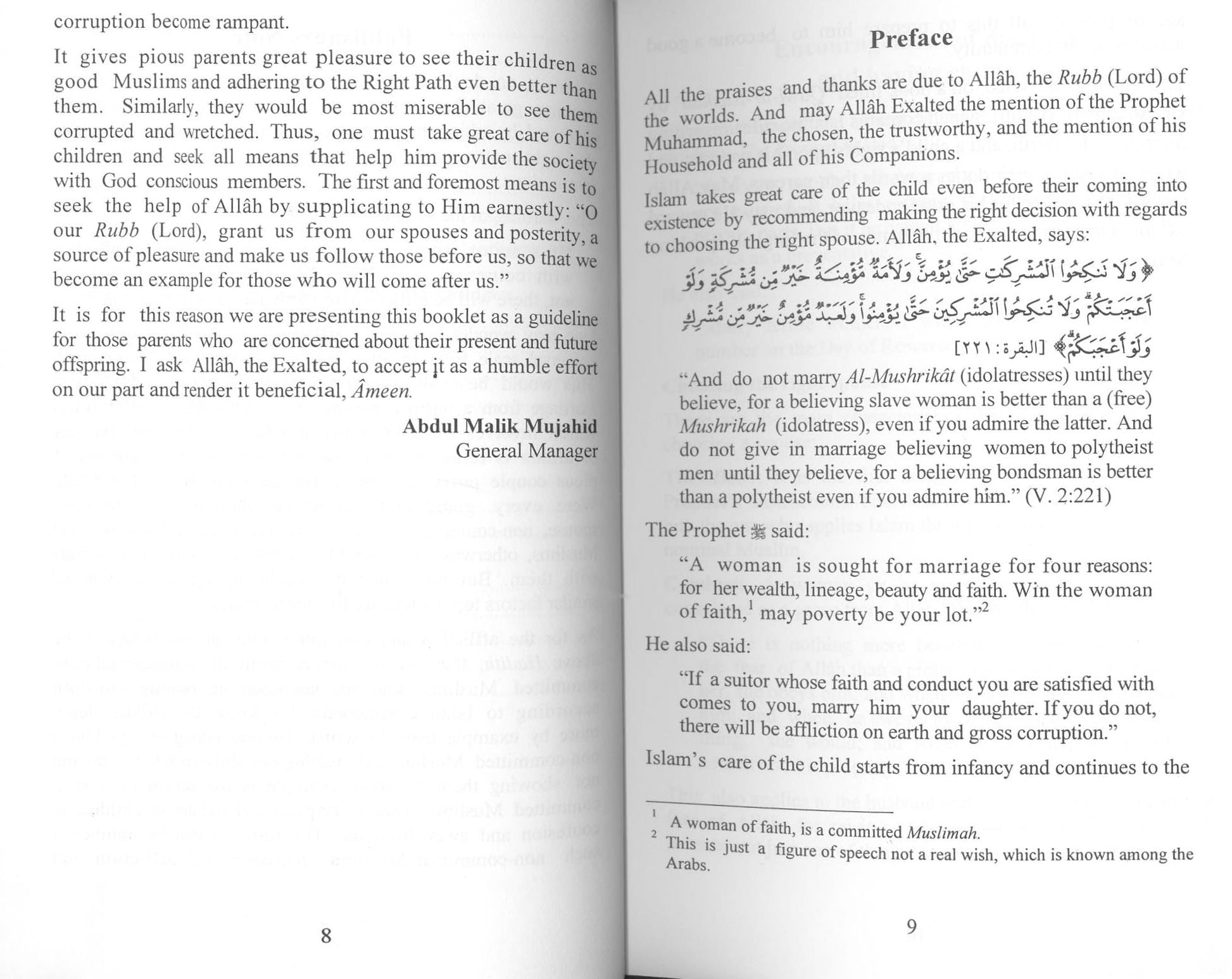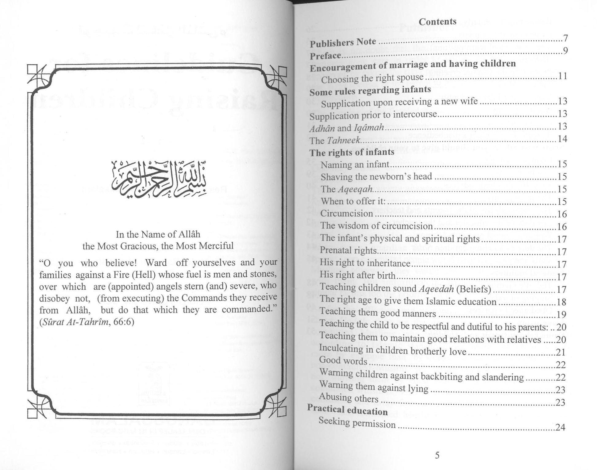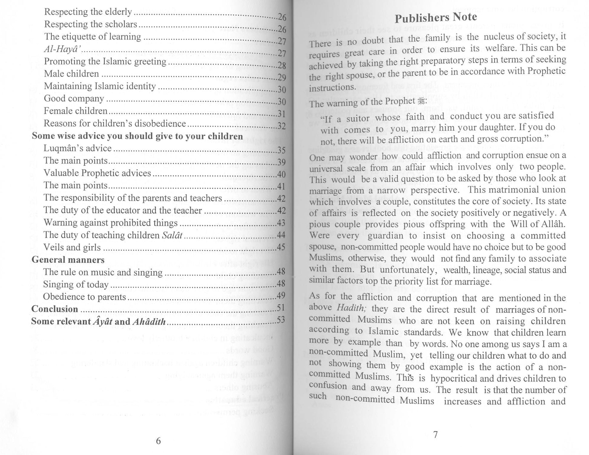Islam places great emphasis on the child, right from infancy to the age of puberty. The reason for this is to prepare him to become a good member of the community. Children learn more by example than by words. Telling our children what to do and not showing them by a good example is a hypocritical act and drives children to confusion and away from us. It is for this reason we are presenting this booklet as a guideline for those parents who are concerned about their present and future offspring.