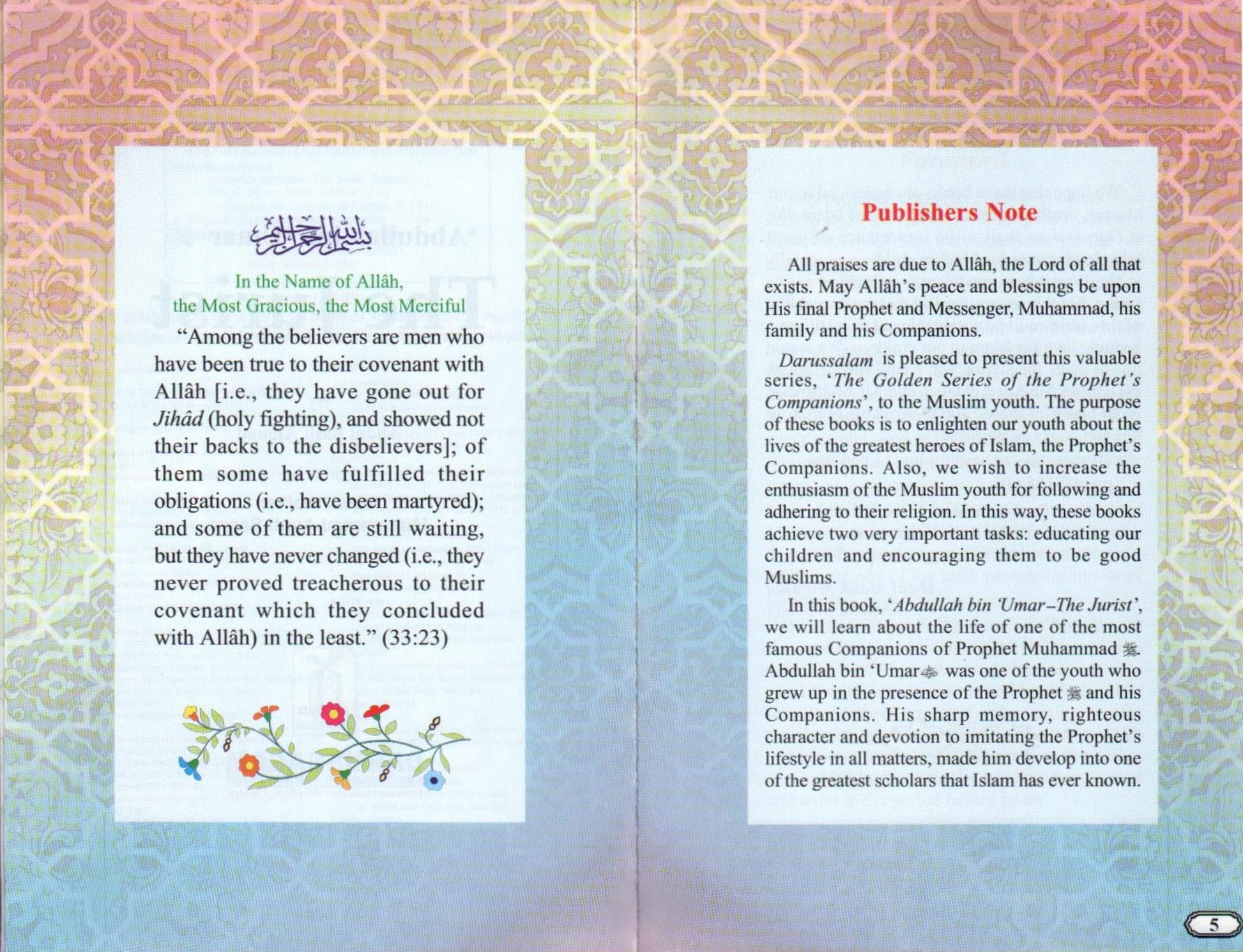 Certain Youth Had The Fortunate Opportunity Of Being Raised In The City Of Ai-Madinah During The Lifetime Of The Prophet Muhammad صَلَّىاللهُعَلَيْهِوَسَلَّمَ. They Witnessed Islam Grow From Its First Days And Were Instilled With Strong Faith At Very Young Ages. One Of these Auspicious Personalities Was Abdullah Bin 'Umar رَضِيَٱللَّٰهُعَنْهُمَا, The Son of 'Umar Bin Ai-Khattab رَضِيَٱللَّٰهُعَنْهُ. His Close Accompanying Of The Prophet صَلَّىاللهُعَلَيْهِوَسَلَّمَ And Memorization Of The Prophet's Sayings And Actions Eventually Led To His Attainment Of Great Scholarship, Even Amongst The Prophet's Companions. In These Pages You Will Read The Amazing Saga Of Abdullah Bin 'Umar's Life Amongst Allah'S Chosen Party Of Believers.