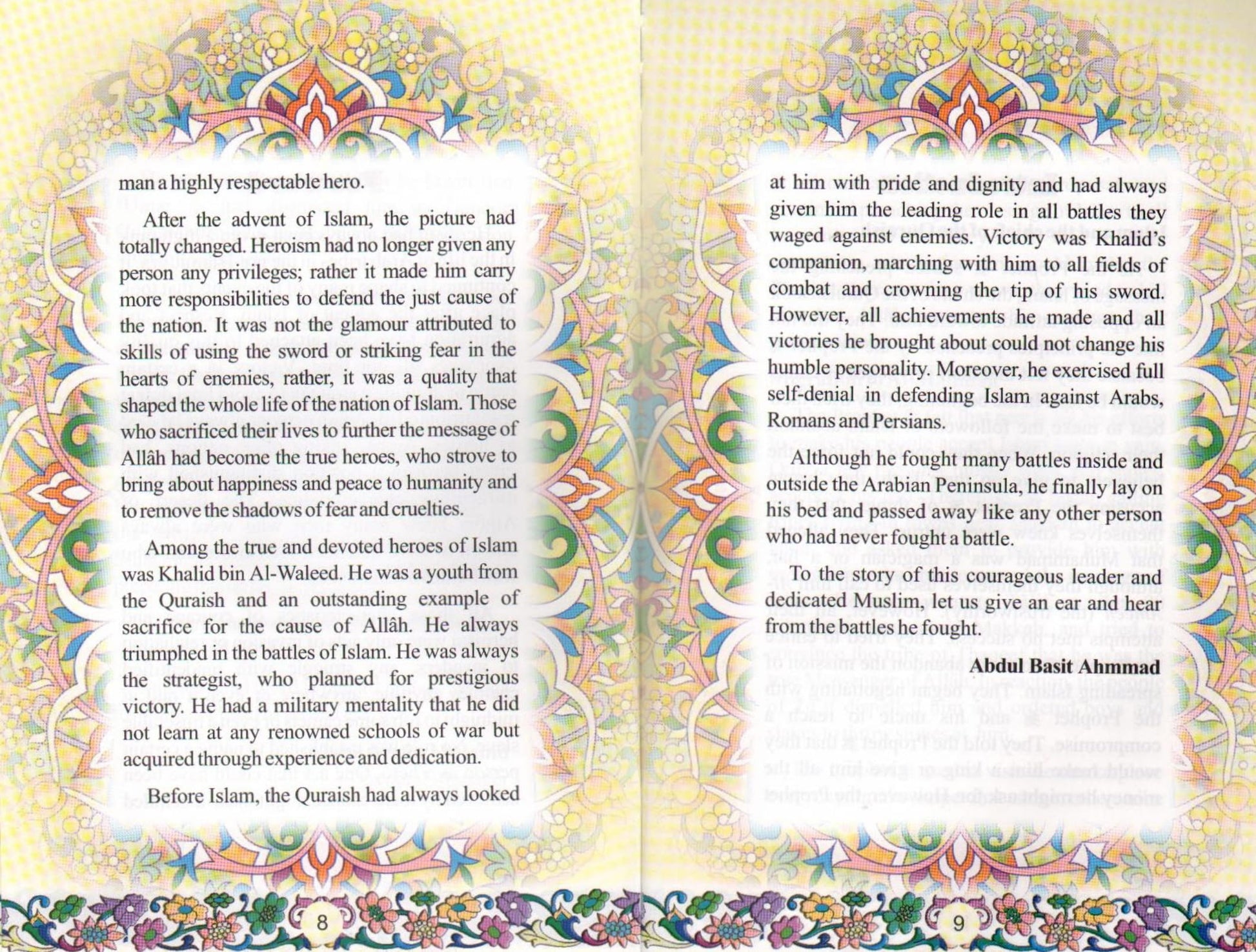 Khalid Bin Al-Waleed رَضِيَ ٱللَّٰهُ عَنْهُ Was The Hero Of Islam. He Led Several Battles And Was Always Victorious. He Conquered The Apostates, Especially Musailamah Al-Kadhab (The Liar) And Restored Order And Peace To The Arabian Peninsula. He Devised Military Tactics, Which, By The Help Of Allah, Made Him Defeat The Huge Roman Army. He Was Very Tough With His Enemies But At The Same Time Very Lenient With His Brother Muslims. When He- Died, 'Umar Bin Al-Khattab رَضِيَ ٱللَّٰهُ عَنْهُ Cried and Said: "Women Would Never Give Birth To One-Like You."