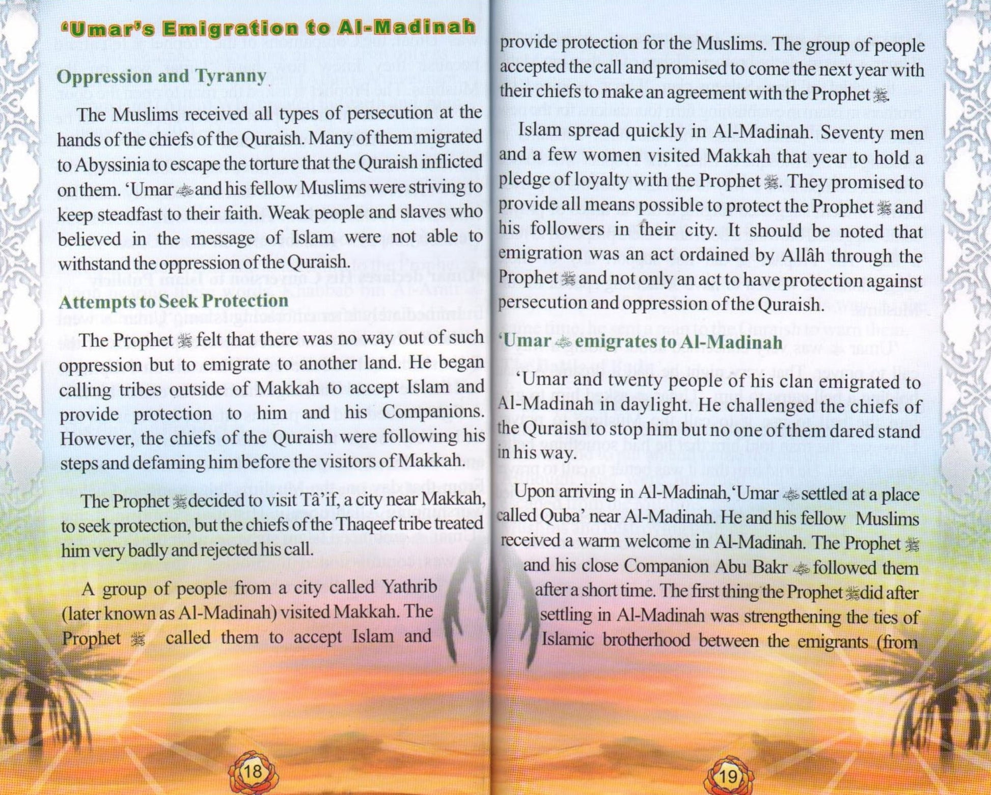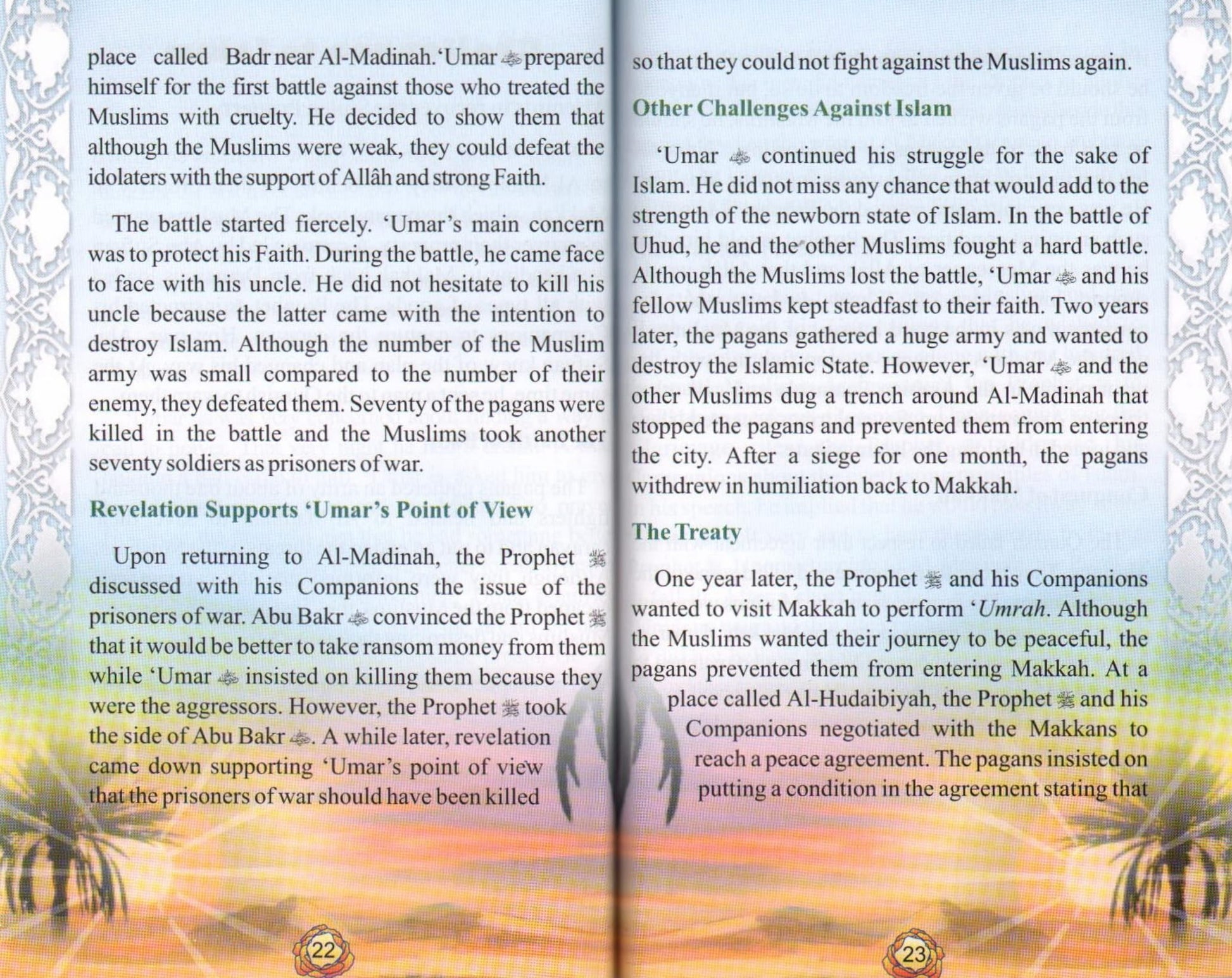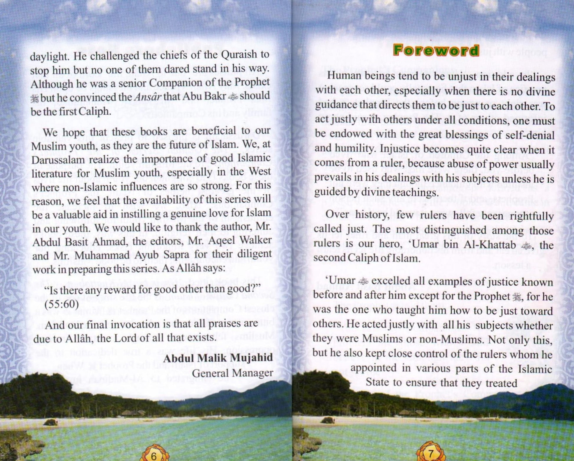 'Umar Bin Khattab رَضِيَ ٱللَّٰهُ عَنْهُ Is One Of The Great Companions Of The Prophet صَلَّى اللهُ عَلَيْهِ وَسَلَّمَ and Second Caliph Of Islam. He Was So Firm In His Practice Of Islam That He Usually Could Sense What Was Right Or Wrong Before The Prophet صَلَّى اللهُ عَلَيْهِ وَسَلَّمَ Had Informed Others Of It. He Used To Say His Friends: If A Mule Stumbles Near The Euphrates River, I Fear Being Questioned By Allah As To Why I Had Not Paved The Road For It. This Book Sheds Light On The Life And Struggle Of The Greatest Example Of A Just Ruler. We Should Follow His Footsteps To Maintain Justice In Every Walk Of Our Life.